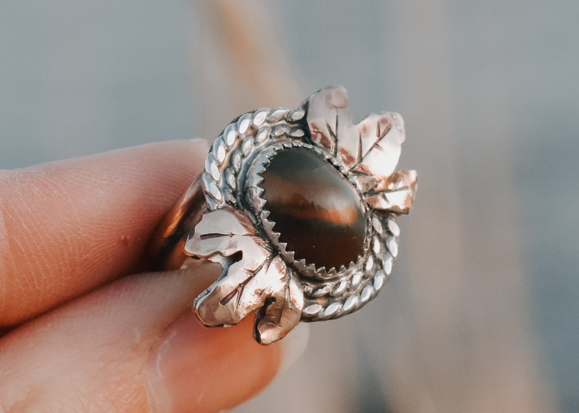 Green picture Jasper with red detailing, with hand sawn and detailed leaf accents and a funky swirled ring band