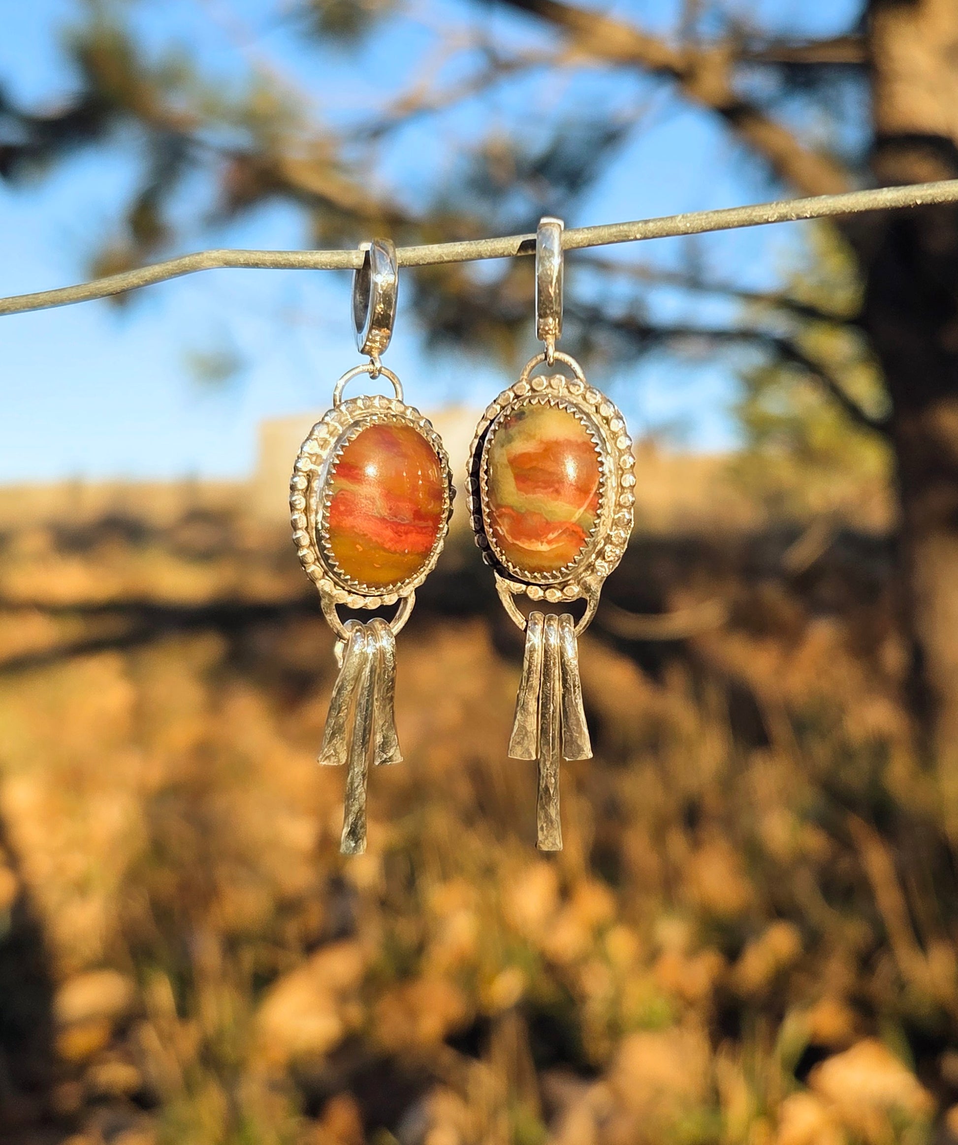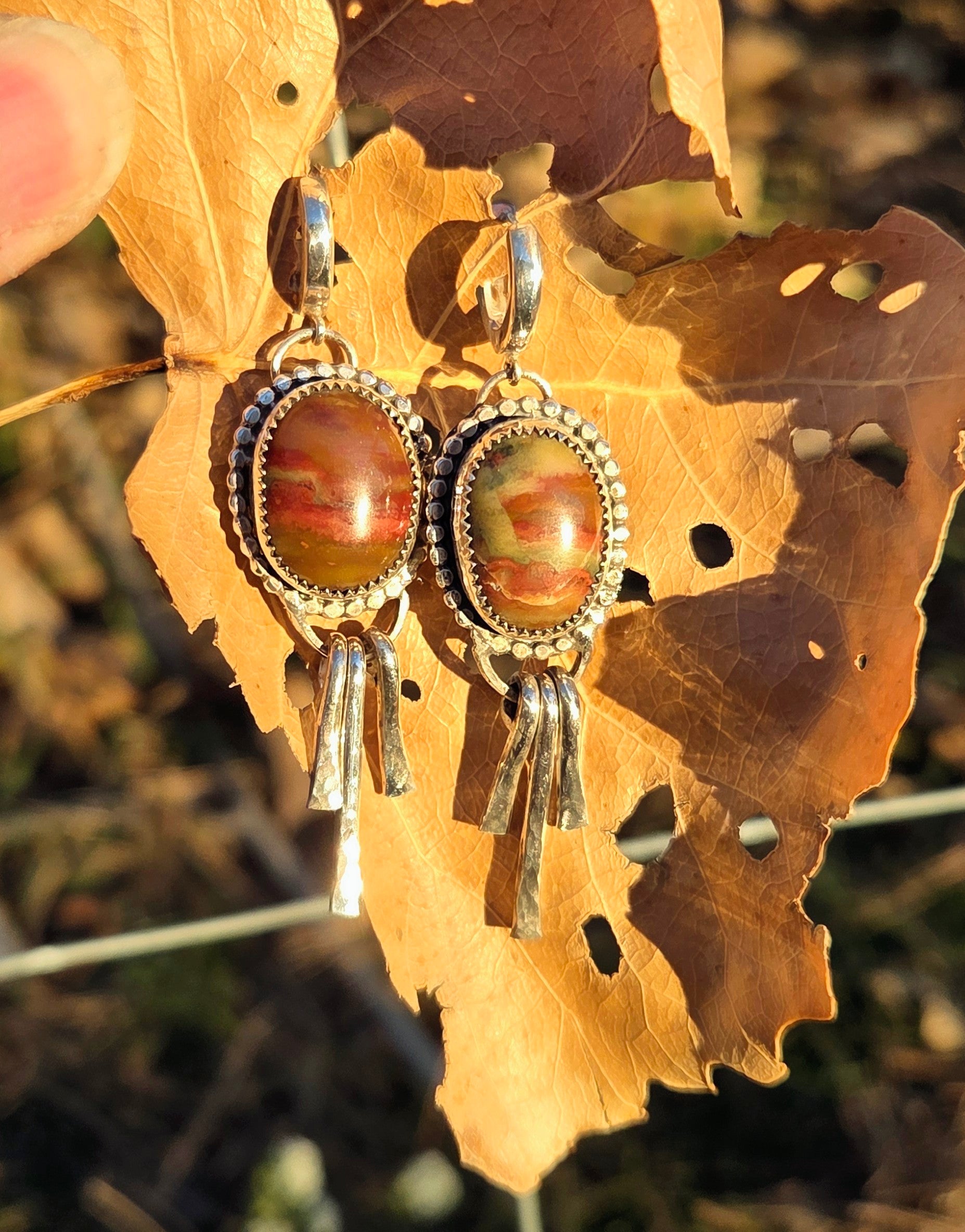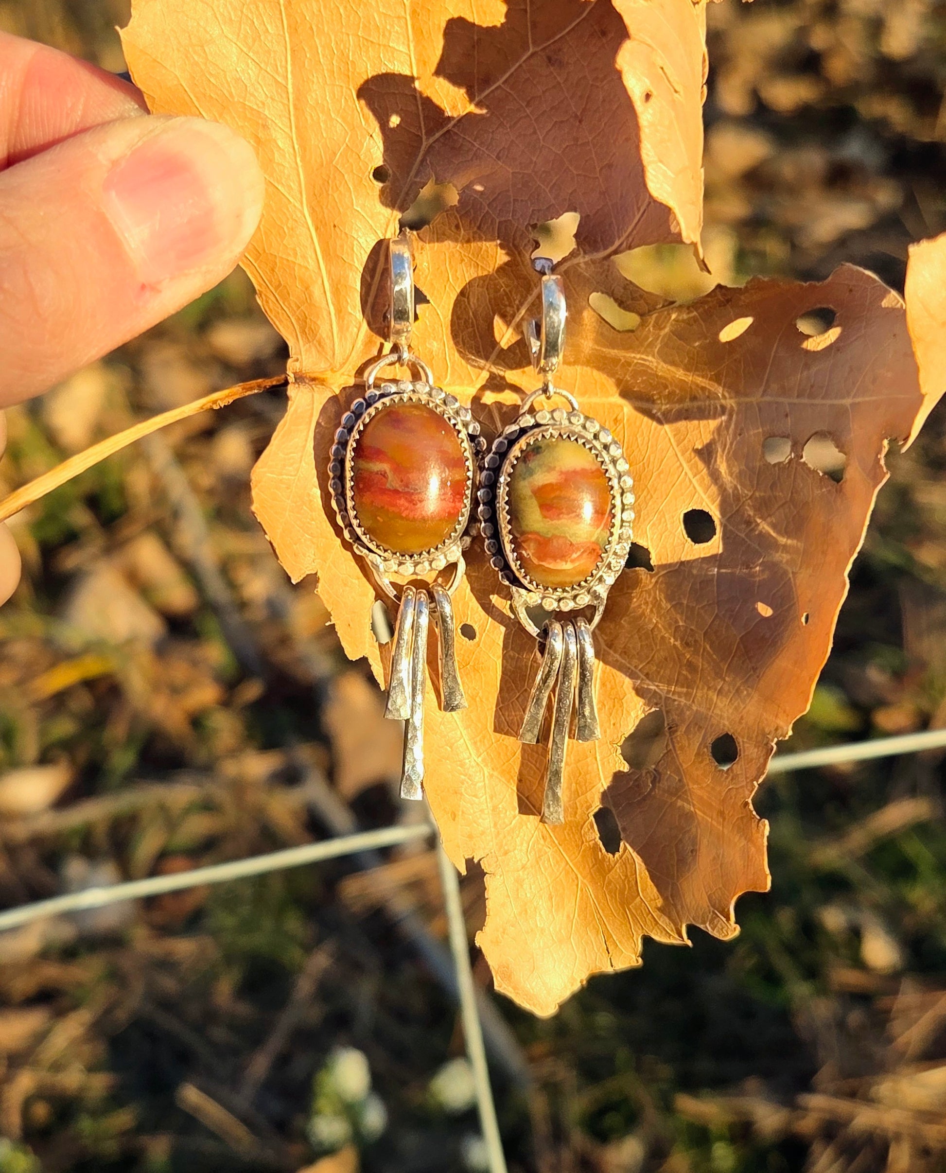 Picture Jasper stones with hand shaped dangle accents and small hugging findings.