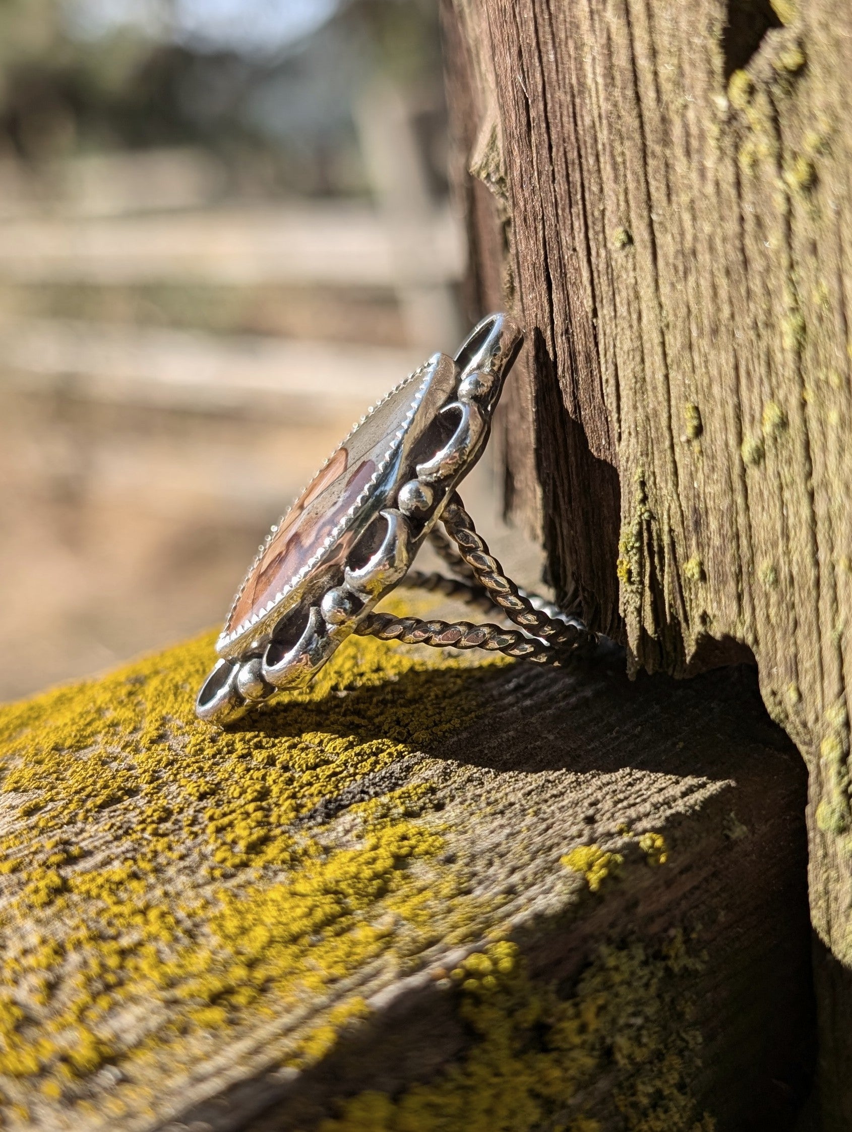 Blue Biggs jasper with hand shaped lacy details and a split twisted band.