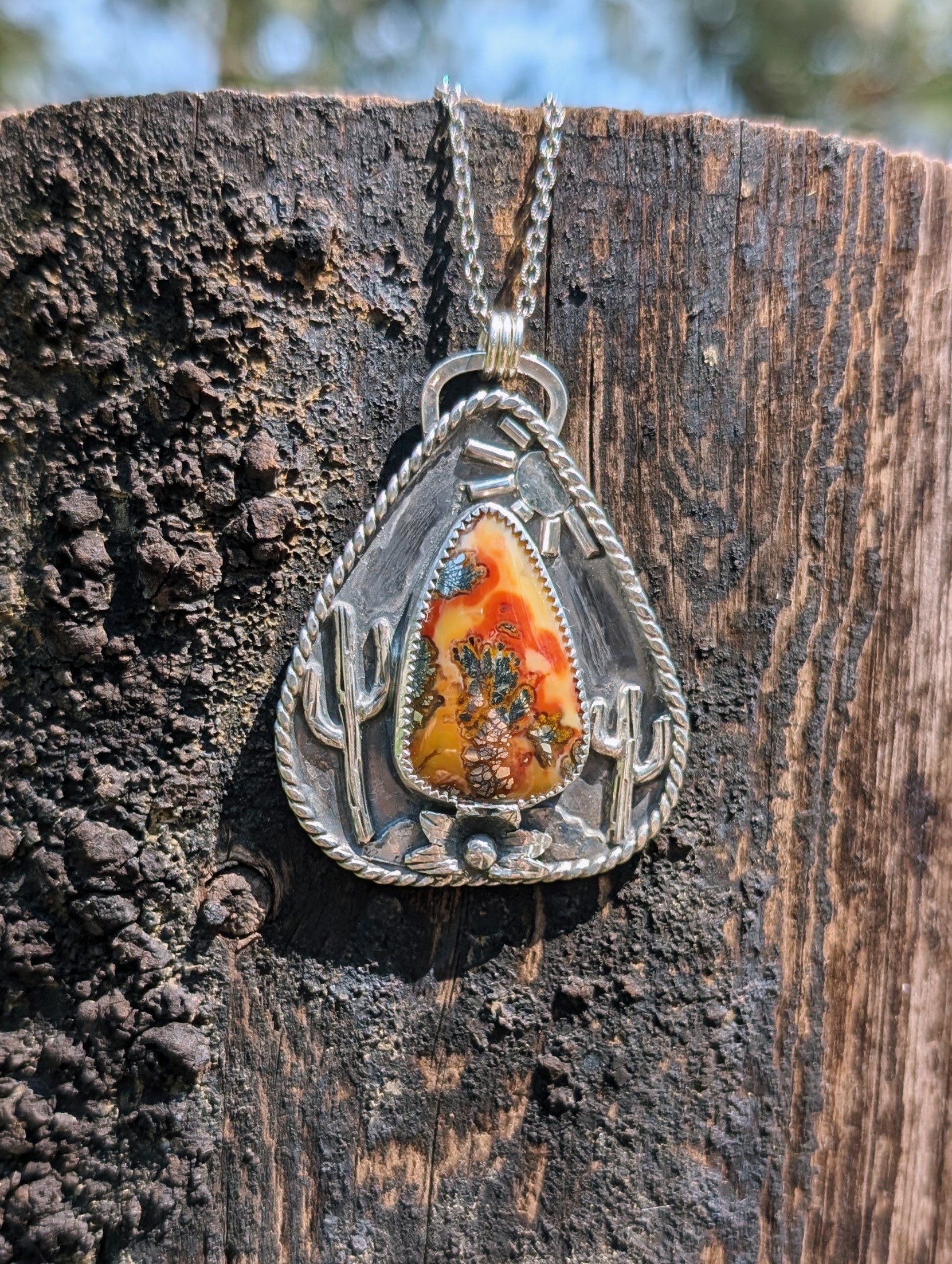 Marcasite with hand detailed desert scene details. Shipped with an 18 inch silver chain. Message me if you'd prefer a different chain.