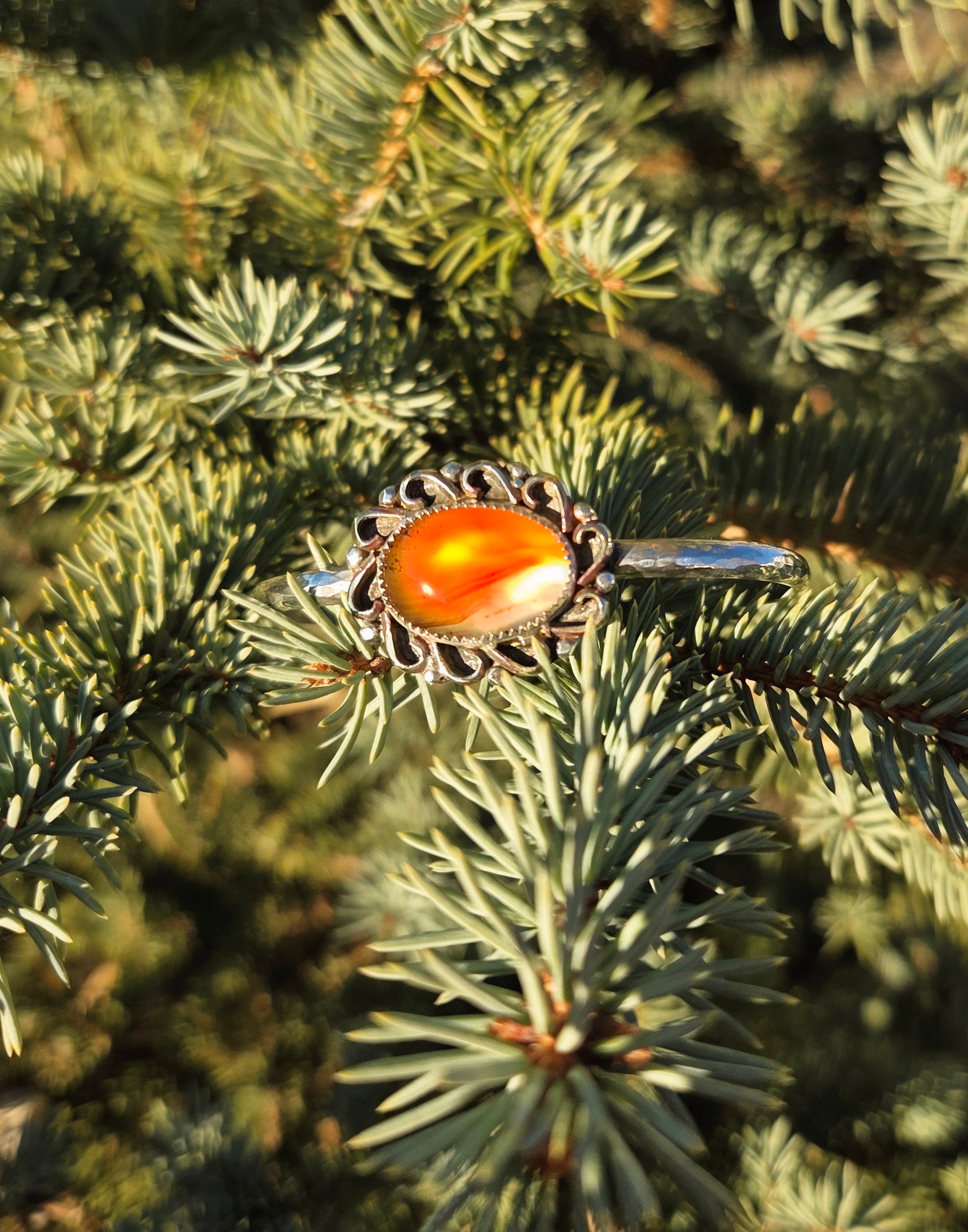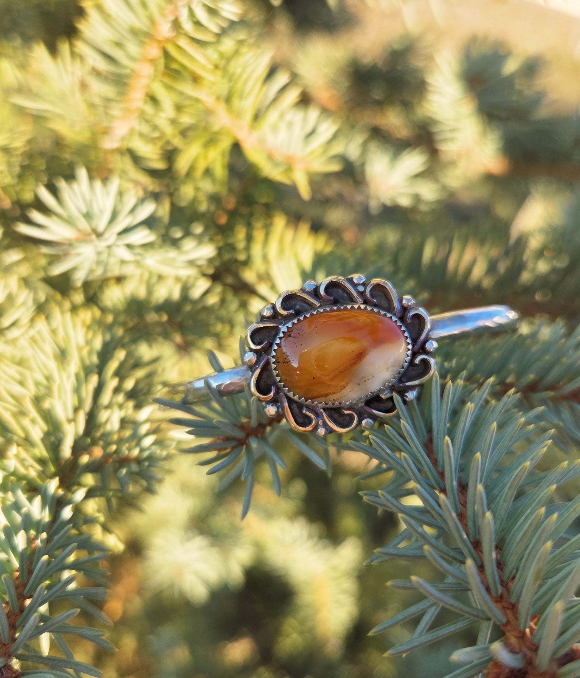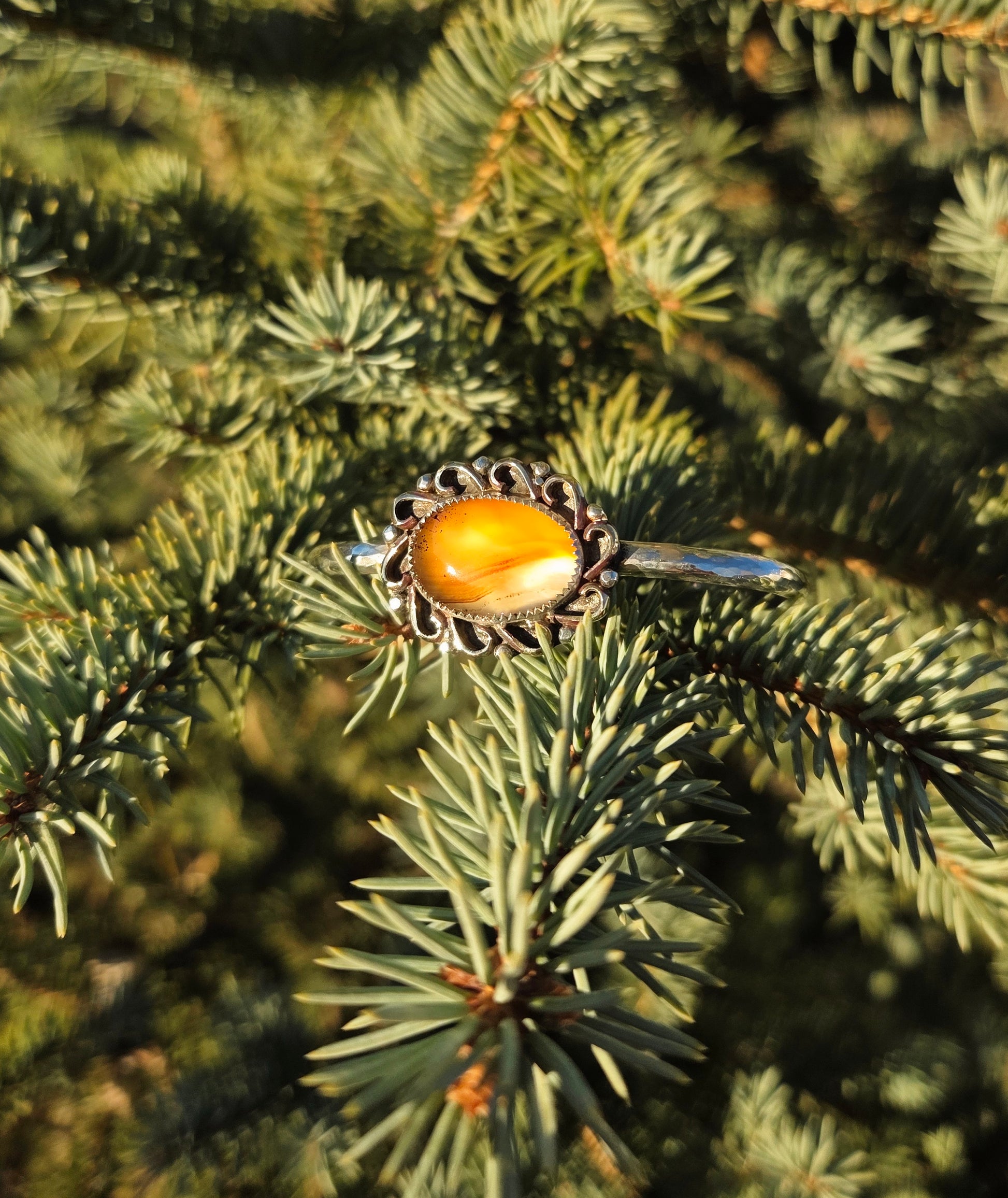 An insanely glowy Montana agate, yes it flashes both yellow and that warm red in the first photo! With hand shaped accents and a hammered cuff band.