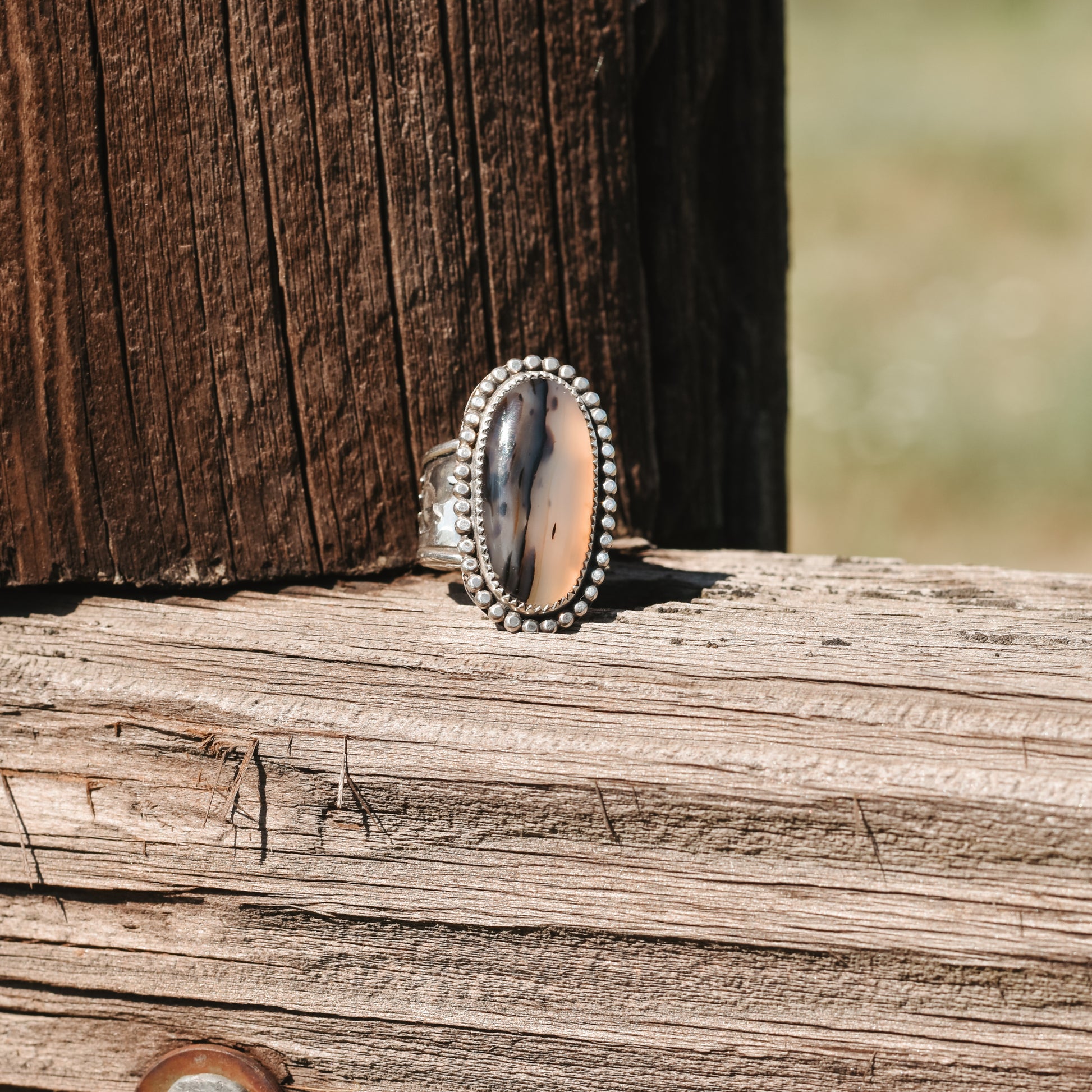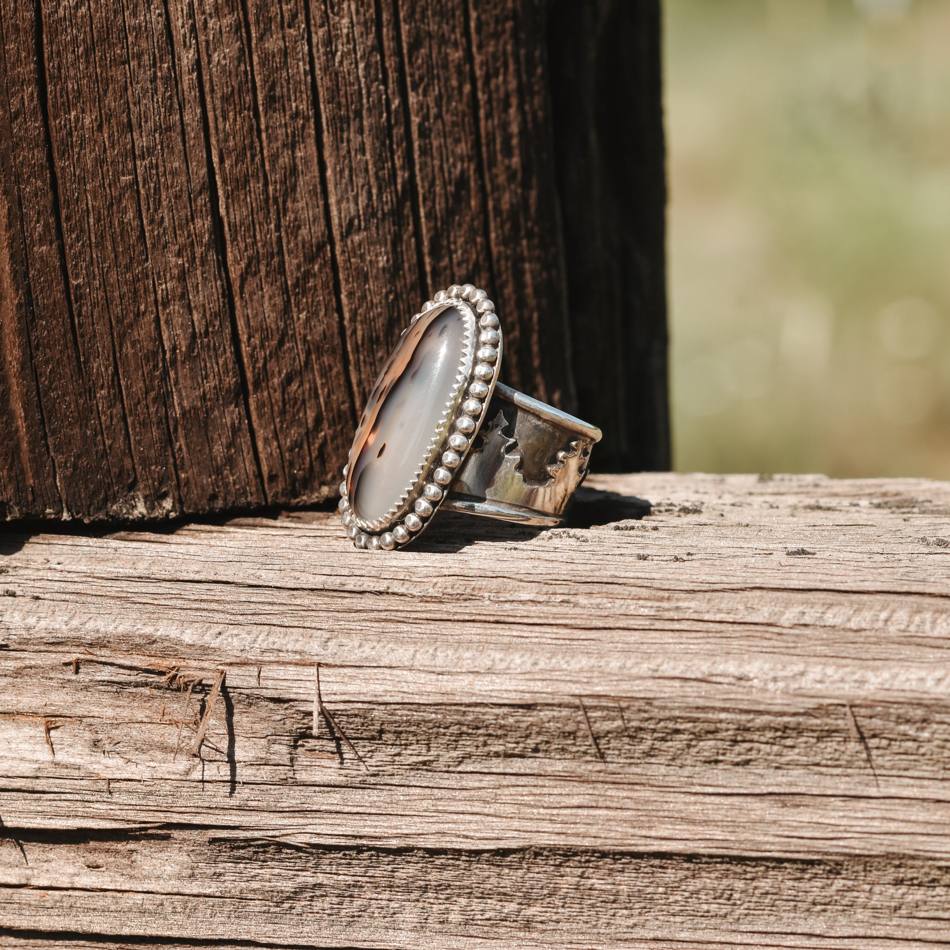 A Montana Agate stone with hand sawn trees on a comfort fit band!