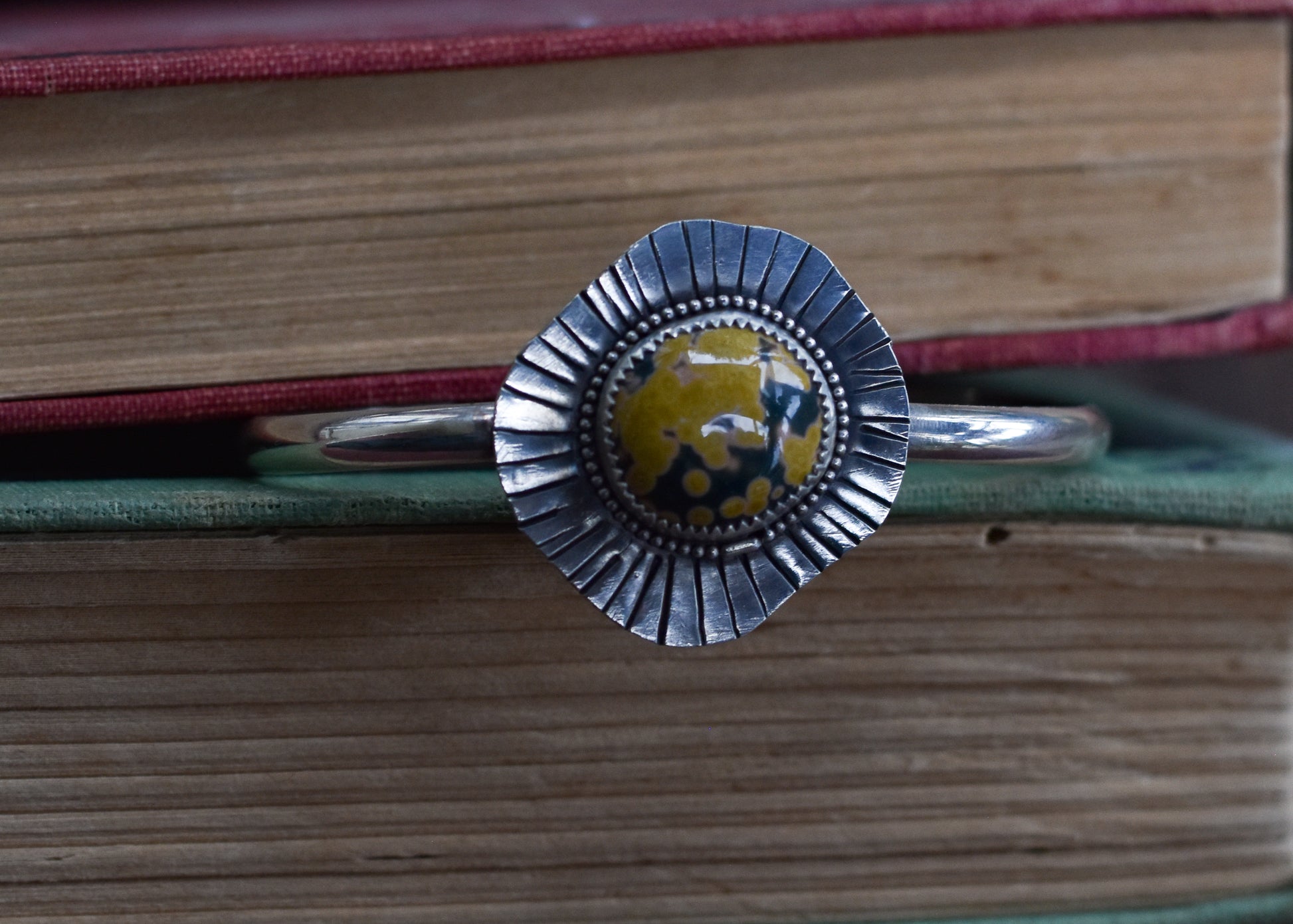 A round ocean jasper stone with an organic stamped border and brushed silver cuff band