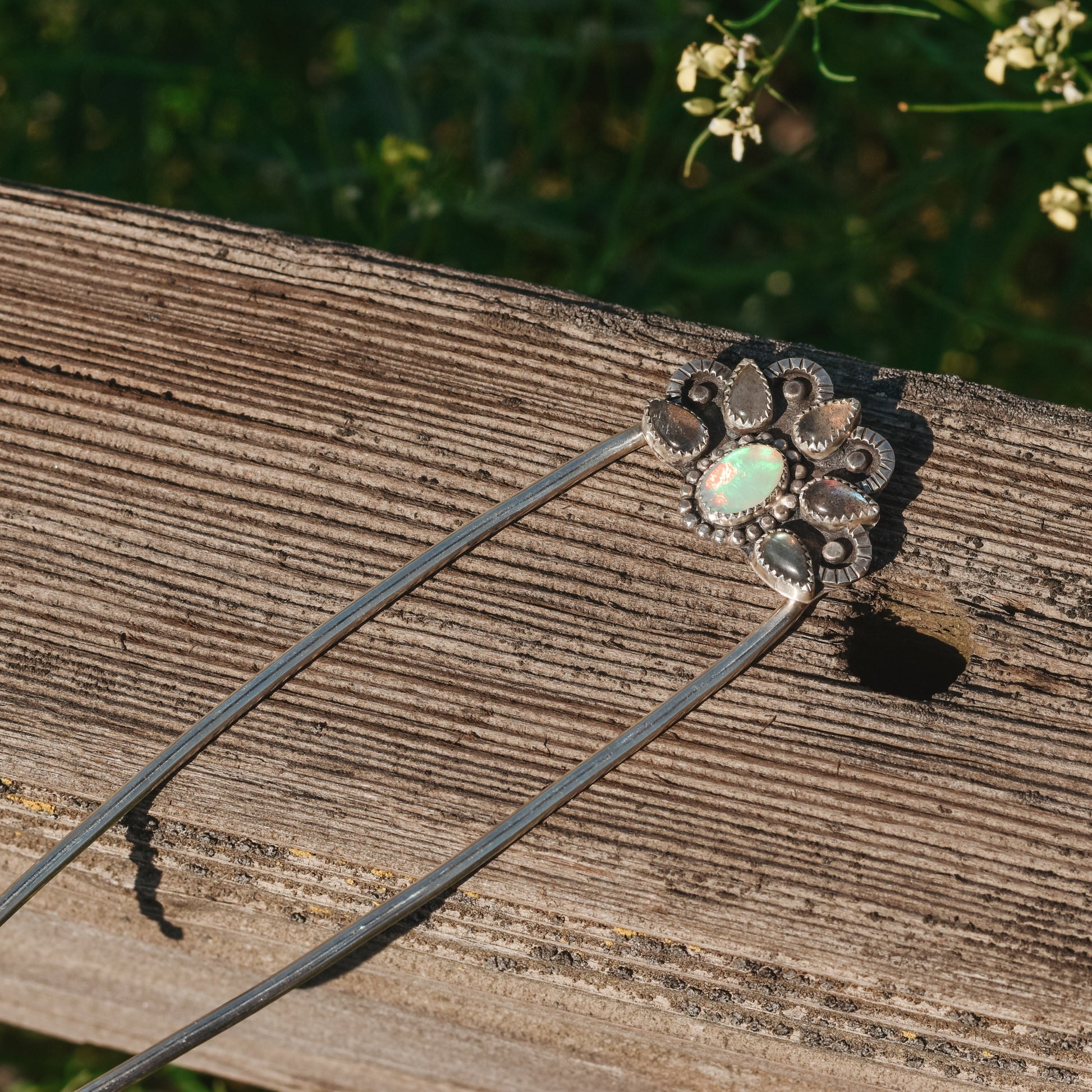 Opal and Labradorite stones with hand shaped accents and long hair fork 'legs'