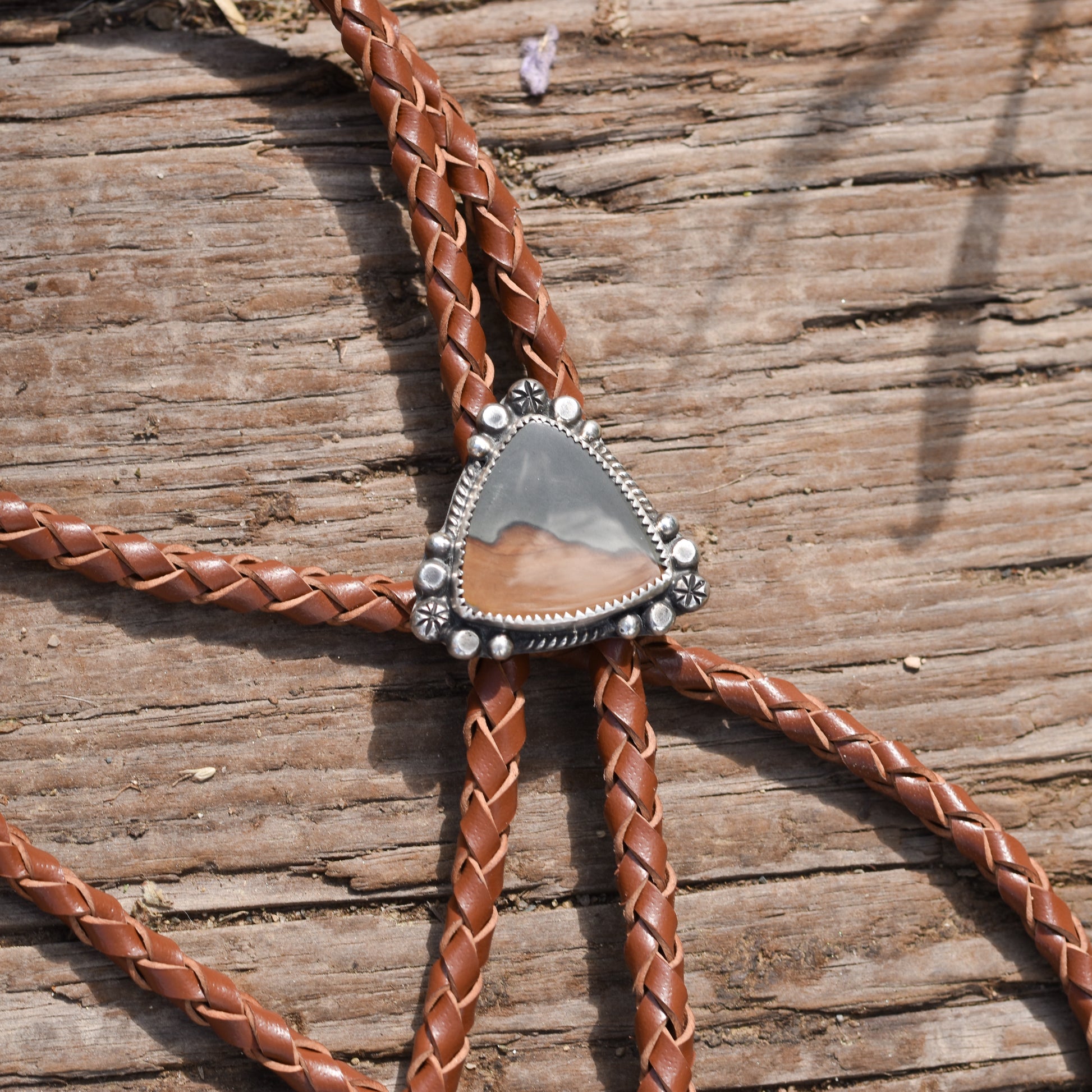 Owyhee jasper with delicate silver accents and a hand braided bolo cord, with hand formed ends. This baby is the picture of adventure, and beautiful for any gender to wear.