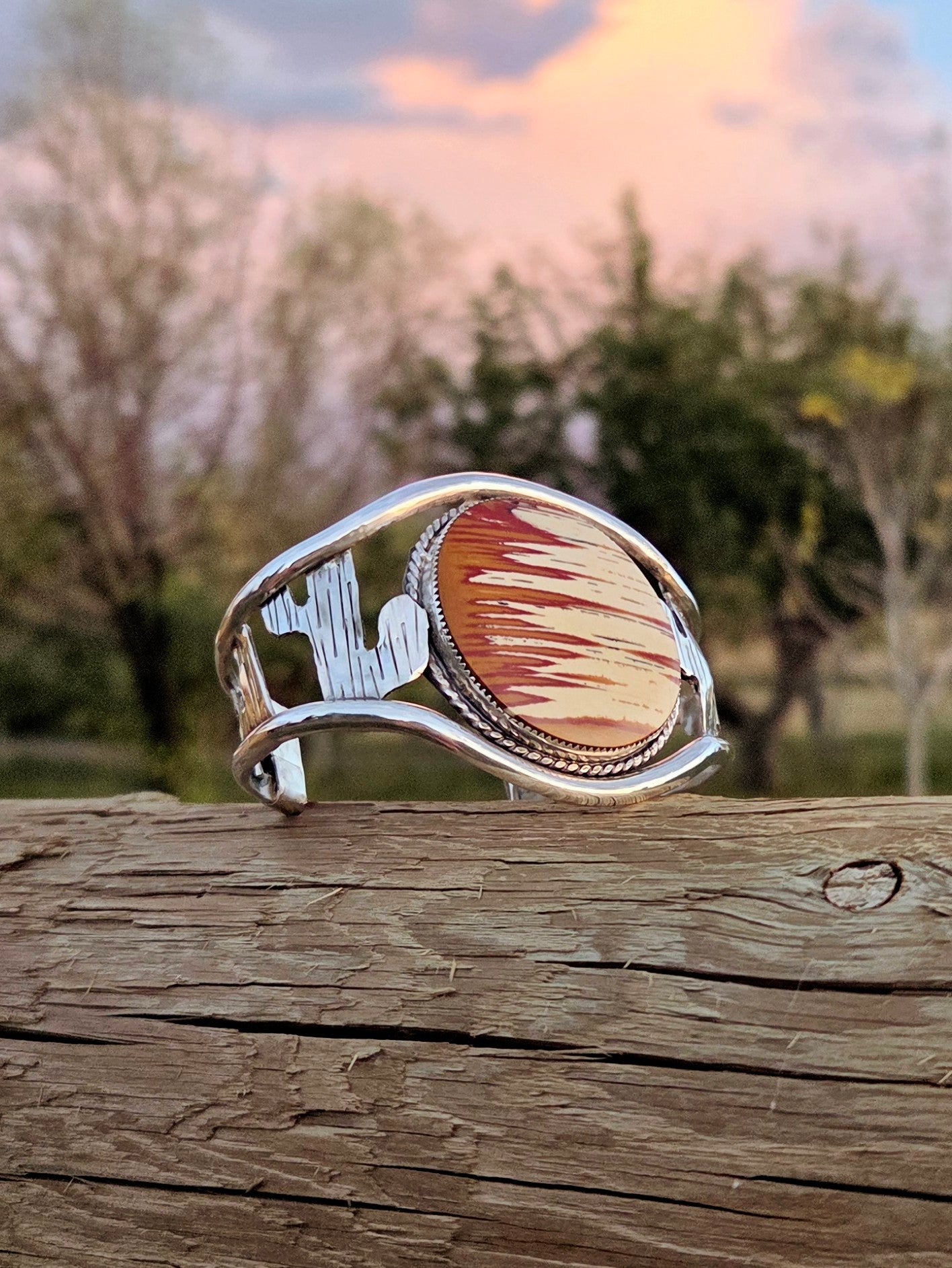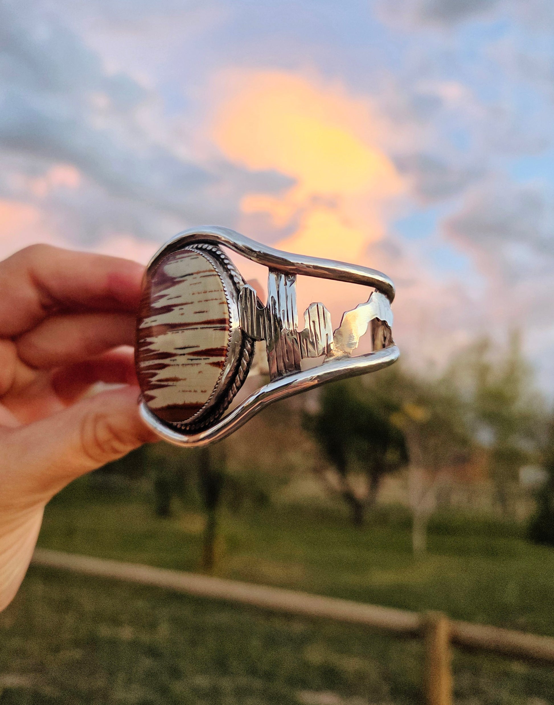This is a BIG piece. If you like statement cuffs, this is your girl. An insane piece of owyhee Jasper with hand sawn and detailed cactus and arch accents.