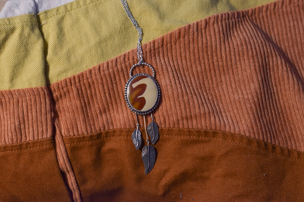 An oval Owyhee jasper stone with hand sawn dangling feathers.